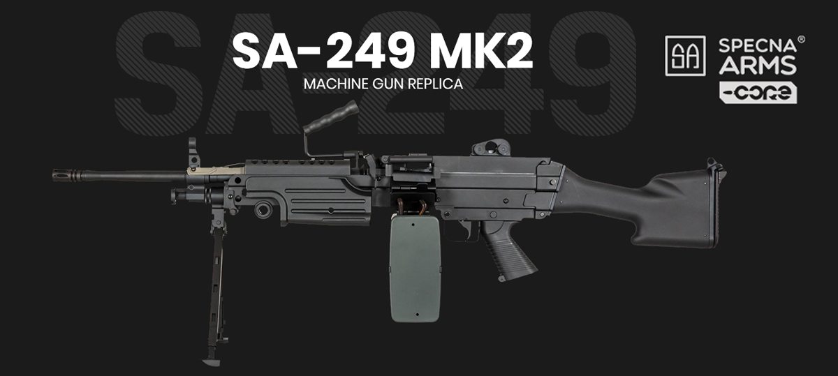 La SA-249 est alimentée par une gearbox propriétaire M249 en métal et très résistante. En interne, on y trouve un ressort de puissance M120, des bagues d'engrenages sur roulements de 8mm, un guide-ressort sur roulement, des engrenages en acier et une chambre hop-up "ROTARY" en métal.