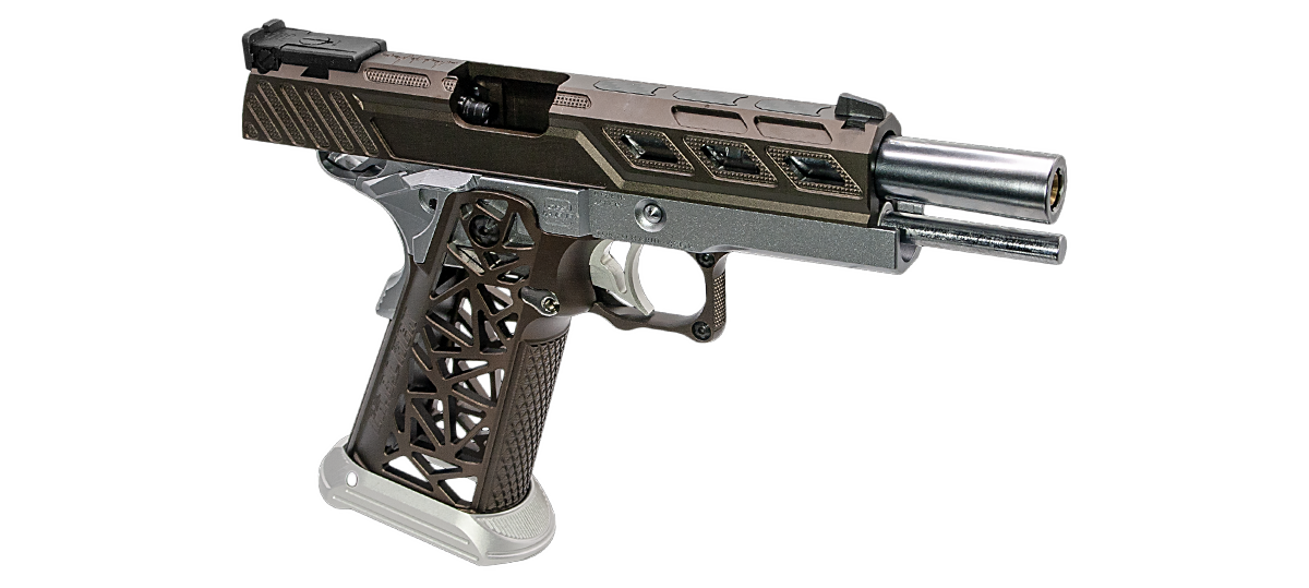 Épuré, raffiné et performant, le hi-capa "Silver Wood" se distingue par une alliance subtile entre la profondeur d’un tan boisé et plusieurs parties argentées.